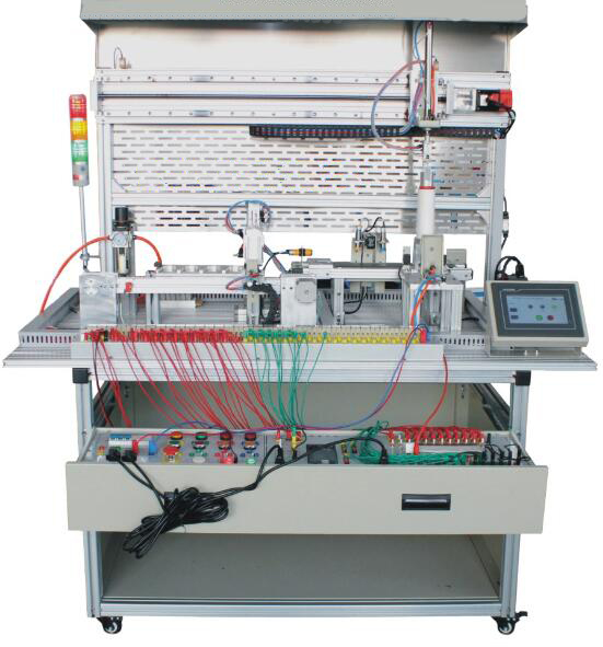 本裝置是依據(jù)機(jī)電一體化教學(xué)的要求而精心研制的。它在接近工業(yè)生產(chǎn)制造現(xiàn)場(chǎng)基礎(chǔ)上又針對(duì)教學(xué)及實(shí)訓(xùn)目的進(jìn)行了專門設(shè)計(jì),強(qiáng)化了機(jī)電一體化的安裝與調(diào)試能力。實(shí)訓(xùn)裝置由型材導(dǎo)軌式實(shí)訓(xùn)臺(tái)、典型機(jī)電一體化設(shè)備機(jī)械部件、PLC模塊、變頻器模塊、按鈕模塊、電源模塊、模擬生產(chǎn)設(shè)備實(shí)訓(xùn)模塊(包含上料單元、皮帶輸送檢測(cè)單元、氣動(dòng)機(jī)械手搬運(yùn)單元、物料傳送倉儲(chǔ)單元、物料返回單元)、觸摸屏、接線端子排和各種傳感器等組成。采用開放式和拆裝式結(jié)構(gòu),可根據(jù)現(xiàn)有的機(jī)械部件組裝生產(chǎn)設(shè)備,使整個(gè)裝置能夠靈活的按實(shí)訓(xùn)教學(xué)或競(jìng)賽要求組裝具有生產(chǎn)功能的光機(jī)電一體化設(shè)備。模塊采用工業(yè)標(biāo)準(zhǔn)結(jié)構(gòu)及抽屜式模塊放置架,互換性強(qiáng)。