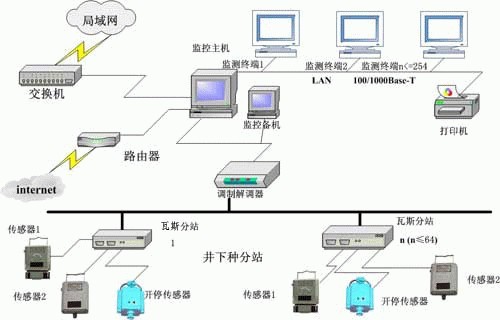 設(shè)備包括:系統(tǒng)軟件、監(jiān)測(cè)分站、傳感器、傳輸線路、調(diào)制器、打印機(jī)、監(jiān)控主機(jī)、監(jiān)控終端、交換機(jī)、路油器等