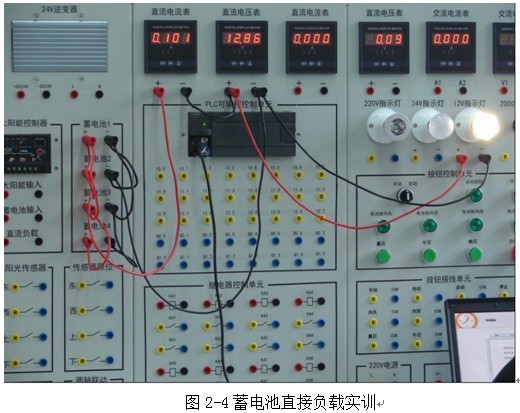 4、蓄電池直接負載實訓(xùn):將蓄電池的輸出端串并成24v電壓輸出形式,將線直接接到24v負載兩端,觀察電壓電流的變化情況。在將蓄電池的輸出端串并成12v電壓輸出形式,將線直接接到12v負載兩端,觀察電壓電流的變化情況。如圖2-4所示: