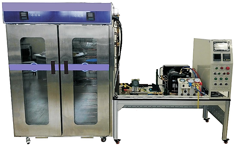 該設(shè)備選用真實(shí)的制冷元器件,真實(shí)的冷庫庫體,完全達(dá)到工業(yè)要求的制冷效果。該設(shè)備在控制方面引入了PLC+觸摸屏+組態(tài)監(jiān)控&單片機(jī)+智能儀表的控制模式,在制冷系統(tǒng)方面使用了電子膨脹閥,能準(zhǔn)確穩(wěn)定地控制蒸發(fā)器的流量,從而精確地控制庫內(nèi)溫度。另外觸摸屏及組態(tài)監(jiān)控的人機(jī)交互界面很直觀友好,在實(shí)訓(xùn)考核過程中還可以用于現(xiàn)場評分。設(shè)置了一個(gè)系統(tǒng)操作臺(tái),在庫體一側(cè)安裝有可更換側(cè)板,以便于學(xué)員在上述的操作臺(tái)與側(cè)板上安裝制冷系統(tǒng)和電路系統(tǒng)等。庫門采用全透明材料,透過庫門能清晰看到系統(tǒng)的內(nèi)部結(jié)構(gòu)。回收符合環(huán)保要設(shè)備選用R134a制冷劑。
