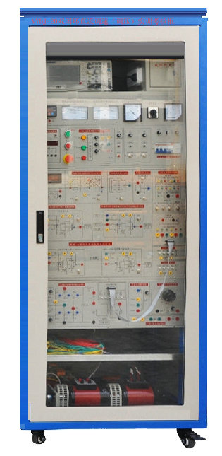 2、控制柜最上部為示波器放置區(qū)和設(shè)故箱,中間部分為電源控制部分,實訓(xùn)接線區(qū)和相應(yīng)的監(jiān)控儀表,裝有±300V直流電壓表、±2.0A直流電流表和數(shù)字轉(zhuǎn)速表用于指示直流電機(jī)的運(yùn)行狀態(tài),控制柜下部裝有三相同步變壓器、三相電流互感器和功率晶閘管模塊等。