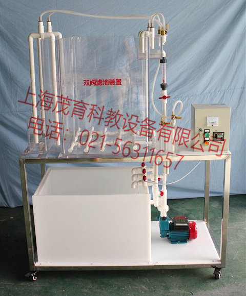 1、雙閥濾池1套:透明有機玻璃材質(zhì)、厚度10mm,包含濾池1格、排水虹吸管1套、進水水虹吸管1組、布水槽1只、虹吸發(fā)生裝置1套、中央反沖洗槽1套、出水渠1只、反沖洗連接管1套;