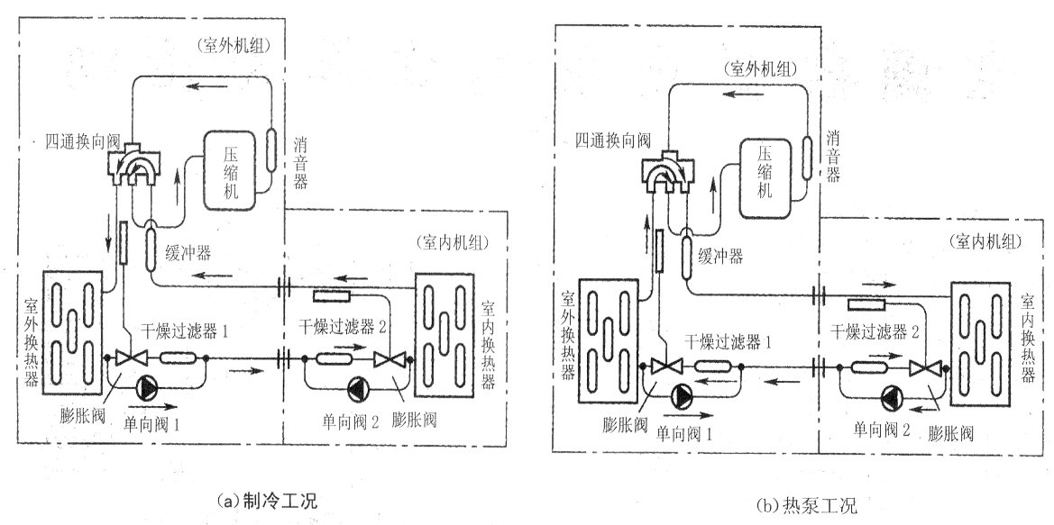 如下圖所示。在通過膨脹閥節(jié)流的熱泵型空調(diào)器中,一般有兩個單向閥和兩個膨脹閥。制冷時,只有制冷膨脹閥起作用,單向閥將制熱膨脹閥短路。制熱時,只有制熱膨脹閥起作用,單向閥將制冷膨脹閥短路。如果制冷正常,但不能制熱或制熱效果不好時,則應重點檢查制熱膨脹閥。故障原因一般是制熱膨脹閥損壞、堵塞或過熱度調(diào)節(jié)不當。