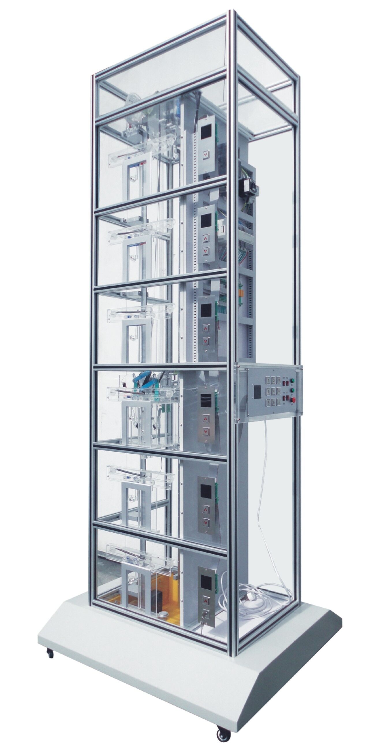 是根據(jù)最常見的升降式電梯結構,采用透明有機材料制成,其結構與實際電梯完全相同,且?guī)缀蹙邆淞藢嶋H電梯的所有功能。為了便于教學,電梯大部分部件均是采用透明有機材料制成,使得電梯的內部結構一目了然;同時,電梯的運行過程,以及每個動作都十分明了,且可以反復實際動手操作。使學生能夠很直觀、透徹地了解、掌握電梯的結構及其動作原理,達到事半功倍的效果。解決了以往電梯教學中單純的理論教學方式或是參觀實際電梯時所帶來的不安全,無法全面了解其內部結構及運行過程等種種實際問題。