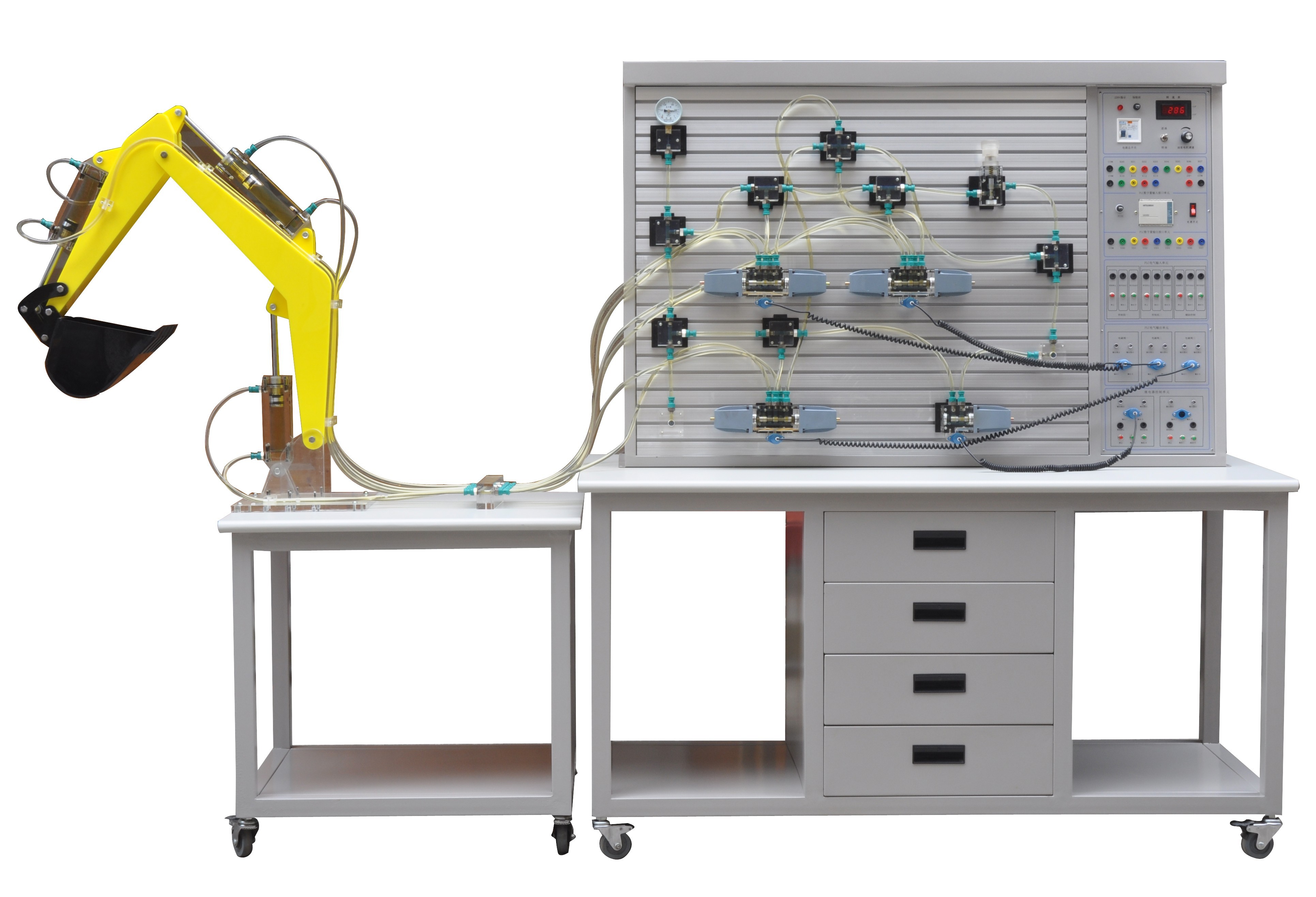 1、在原有透明液壓PLC控制實(shí)驗(yàn)裝置幾十種基本回路上增加了可模擬真實(shí)挖掘機(jī)工作裝置各種動(dòng)作。