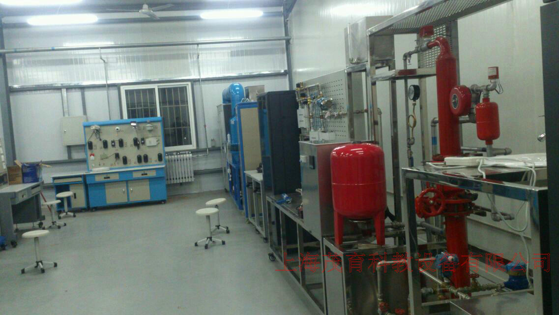 消防給水系統(tǒng):主要有給水箱、噴淋泵、穩(wěn)壓罐、濕式報(bào)警閥、壓力開關(guān)、水流指示器、消防給水管道、閉式噴淋頭等組成。管路采用鍍鋅管進(jìn)行設(shè)計(jì),可進(jìn)行鍍鋅管的切割、套絲、安裝和通水試驗(yàn)操作,通過控制系統(tǒng)可實(shí)現(xiàn)噴淋滅火功能。