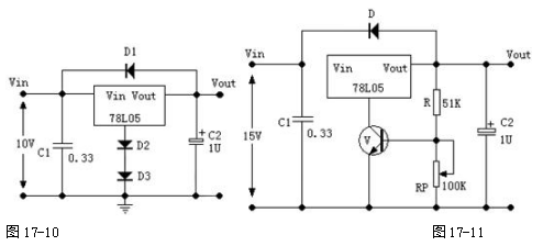 應(yīng)為單電壓輸出時的兩倍。當集成穩(wěn)壓器本身的輸出電壓或輸出電流不能滿足要求時,可通過外接電路來進行性能擴展。圖17-5是一種簡單的輸出電壓擴展電路。如7805穩(wěn)壓器的3、2端間輸出電壓為5V,因此只要適當選擇R的值,使穩(wěn)壓管工作在穩(wěn)壓區(qū),則輸出電壓U