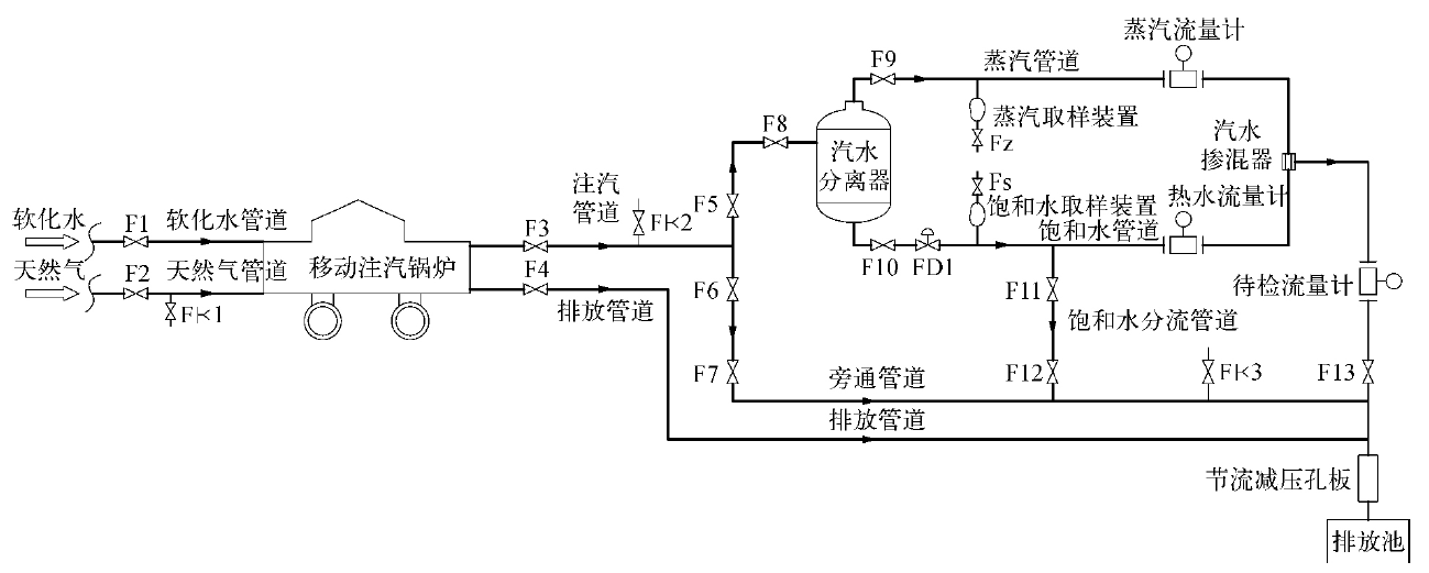 由于移動(dòng)鍋爐蒸汽輸出有下限限制,因而采用閥門F7與F5配合用以分流進(jìn)入標(biāo)準(zhǔn)系統(tǒng)的蒸汽總量,閥門F11與F12用來(lái)分流出一部分水用以提高標(biāo)定系統(tǒng)的蒸汽干度。