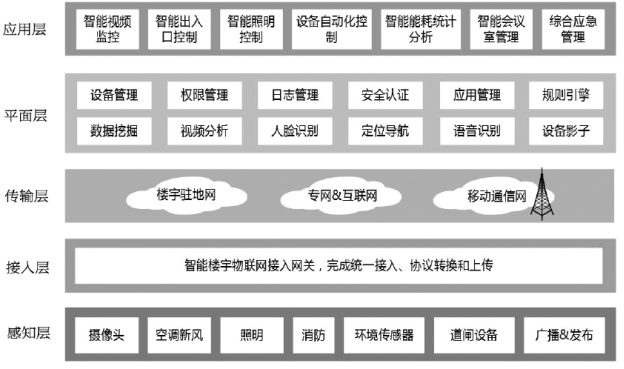 基于物聯(lián)網(wǎng)的智能樓宇綜合管理系統(tǒng)技術(shù)架構(gòu)如圖1所示。系統(tǒng)總共分為感知層、接入層、傳輸層、平臺層和應(yīng)用層五個部分。感知層主要指接受智能樓宇系統(tǒng)統(tǒng)一管理的各種終端設(shè)施,包括動力設(shè)備(空調(diào)、新風(fēng)、排風(fēng)、排水、電梯等)、信息感知及采集設(shè)備(環(huán)境傳感器、音視頻設(shè)備)和控制設(shè)備等。傳輸層主要指由樓宇駐地網(wǎng)、互聯(lián)網(wǎng)(或?qū)>)及移動通信網(wǎng)組成的智能樓宇數(shù)據(jù)傳輸和通信管理網(wǎng)絡(luò)。