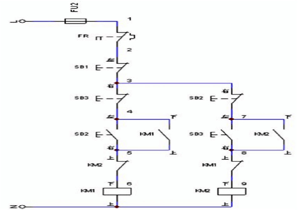 再次,做好原理圖節(jié)點(diǎn)標(biāo)注工作,可選取阿拉伯?dāng)?shù)字代表節(jié)點(diǎn),標(biāo)注時需遵循從上到下、由左往右的順序。如圖1,可選取三相異步電動機(jī)正反轉(zhuǎn)復(fù)合互鎖控制電路的形式分析。如控制電路較為復(fù)雜,為確保節(jié)點(diǎn)標(biāo)注的正確性,需完成每次標(biāo)注后,需對2個相近節(jié)點(diǎn)間觸點(diǎn)是否存在問題進(jìn)行分析,如存在重復(fù)標(biāo)注節(jié)點(diǎn)狀況,需及時做好修正工作。