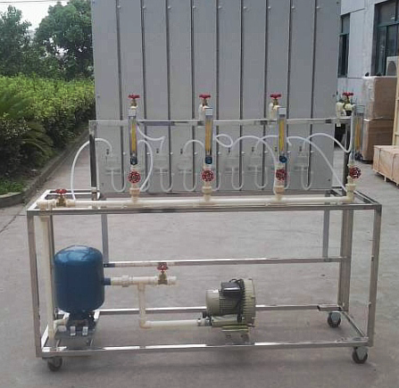 8、單管壓力計(jì)等組成。氣泵工作產(chǎn)生的氣流進(jìn)入穩(wěn)壓罐,經(jīng)瀉流穩(wěn)壓后,供給模擬的燃?xì)庥脩簦總(gè)用戶由支管、流量計(jì)和尾閥組成,在壓差板上設(shè)有9只單管壓力計(jì),可分別測量干管起點(diǎn)的壓力、用戶支管及包含燃具的阻抗在內(nèi)的壓差,而第9只壓力計(jì)則既測量最終用戶的阻抗,又是干管的終點(diǎn)壓力;通過調(diào)整瀉流閥、用戶流量及尾閥進(jìn)行實(shí)驗(yàn)。