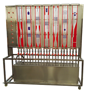 1、水泵為不銹鋼離心泵:功率750W,最大流量7.0m3/h。 2、摻氣量多少及氣泡大小由摻氣裝置可調(diào)。 3、顯示面尺寸:150×1000 mm,優(yōu)質(zhì)有機玻璃制作。 4、燈光照明,大小氣泡隨水流的流動過程均清晰可見。 5、外罩及流場邊界由色彩和諧的有機玻璃制作。 6、水箱:容積100L,304不銹鋼材質(zhì),帶貯水排空底閥,管路循環(huán)回水與泵吸入口間隔板設計。 7、管路:透明材質(zhì),壁厚≥2.5mm。 8、電器:接觸器、開關(guān)、漏電保護空氣開關(guān)。 9、304不銹鋼儀表柜:測控、電器設備在實驗架上。 10、外形尺寸:1600*500*1800mm(長×寬×高),304不銹鋼框架,帶移動腳輪及禁錮腳。 11、工程化標識:包含設備位號、管路流向箭頭及標識、閥門位號等工程化設備理念配套,使學生處于安全的實驗操作環(huán)境中,學會工程化管路標識認知,培養(yǎng)學生工程化理念。 |