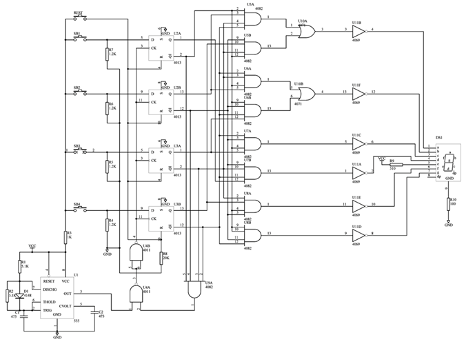 4個D觸發(fā)器的D端作為搶答操作狀態(tài)輸入,設(shè)A組先按按鈕,A組的D=1,在CP作用下,QA=1, =0。由于 =0,使門G1輸出為1,G2門輸出為0,封鎖了CP,使其他后按的D狀態(tài)傳不到Q端。當A輸出為1時,其他輸出為0,通過譯碼電路,使數(shù)碼管顯示“A”字符。字符顯示譯碼器的譯碼表如下。| QA QB QC QD | a b c d e f g |