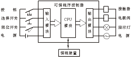 PLC的類型繁多,功能和指令系統(tǒng)也不盡相同,但結(jié)構(gòu)與工作原理則大同小異,通常由主機、輸入/輸出接口、電源擴展器接口和外部設(shè)備接口等幾個主要部分組成。PLC的硬件系統(tǒng)結(jié)構(gòu)如下圖所示: