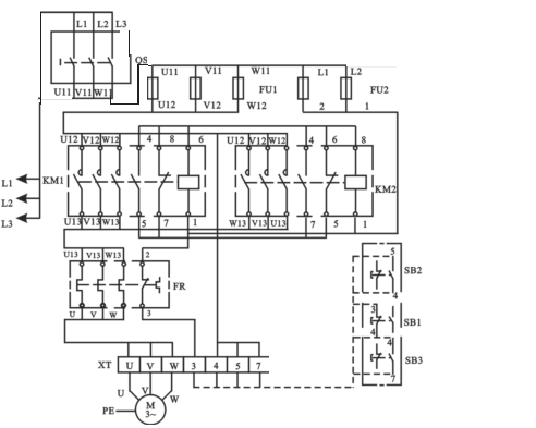 仔細(xì)檢查確認(rèn)接線無誤后,接通交流電源,按下SB2,電機(jī)應(yīng)正轉(zhuǎn)(電機(jī)右側(cè)的軸伸端為順時針轉(zhuǎn),若不符合轉(zhuǎn)向要求,可停機(jī),換接電機(jī)定子繞組任意兩個接線即可)。按下SB3,電機(jī)仍應(yīng)正轉(zhuǎn)。如要電機(jī)反轉(zhuǎn),應(yīng)先按SB1,使電機(jī)停轉(zhuǎn),然后再按SB3,則電機(jī)反轉(zhuǎn)。若不能正常工作,則應(yīng)分析并排除故障,使線路能正常工作。