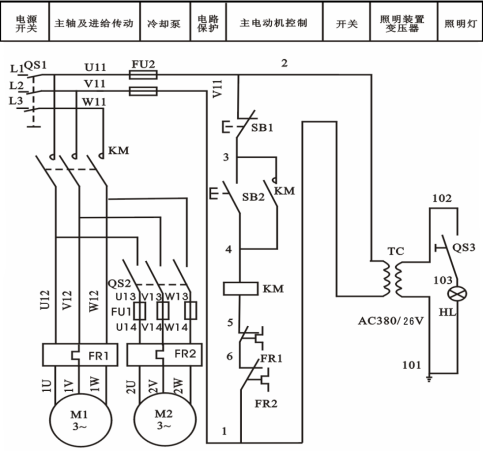 。接觸器KM的線圈通電而鐵心吸合,主回路中接觸器KM的三個常開觸頭合上,主電機(jī)M1得到三相交流電而起動運轉(zhuǎn),同時接觸器KM的常開輔助觸頭也合上,對控制回路進(jìn)行自鎖,保證起動按鈕SB2松開時,接觸器KM的線圈 仍然通電。若加工時需要冷卻,則撥動開關(guān)QS2,讓冷卻泵電動機(jī)M2通電運轉(zhuǎn),帶動冷卻泵供應(yīng)冷卻液。