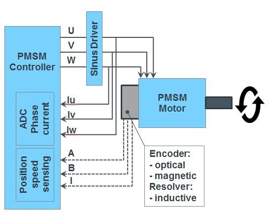 圖1:一個(gè)無(wú)刷直流電機(jī)控制系統(tǒng)需要通過(guò)磁性位置傳感器(通常用于汽車領(lǐng)域)或光學(xué)位置在多數(shù)高端應(yīng)用中,無(wú)刷直流電動(dòng)機(jī)正在被永磁同步電動(dòng)機(jī)(PMSM)所取代。永磁同步電動(dòng)機(jī)代替了無(wú)刷直流電動(dòng)機(jī)中受轉(zhuǎn)矩脈動(dòng)影響的模塊換相方案,而且能在線圈之間自如切換,減少振動(dòng),獲得更高的效率。