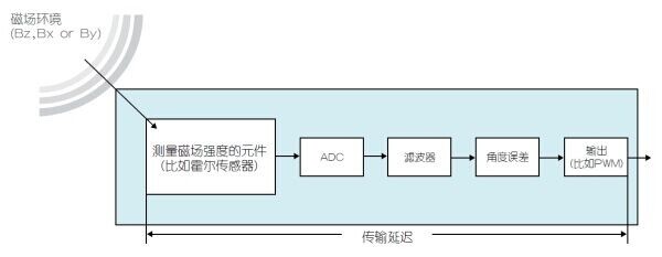 芯片中包含一個(gè)信號(hào)調(diào)節(jié)與處理回路,將測(cè)量出的磁場(chǎng)強(qiáng)度換算為轉(zhuǎn)子的角度位置(以度數(shù)形式)。這一轉(zhuǎn)換所需的時(shí)間就是芯片固定的傳輸延遲(見(jiàn)圖2)。不同芯片延遲持續(xù)的時(shí)間不等,但當(dāng)今市場(chǎng)上的芯片傳輸延遲通常在10μs到400μs之間。