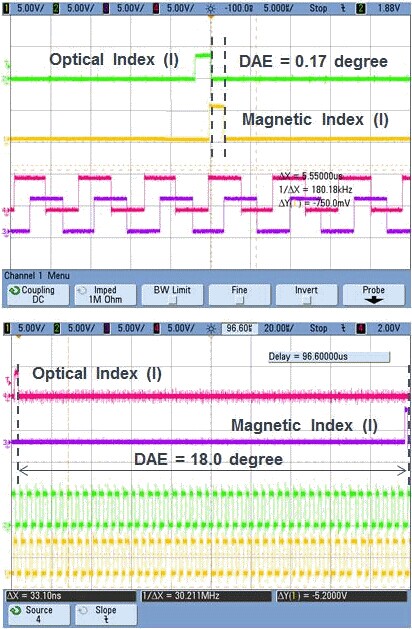 圖5:集成補(bǔ)償方案的傳感器輸出(上)以及未集成補(bǔ)償方案的傳感器輸出(下)圖6顯示了AS5147(左)與傳統(tǒng)磁性位置傳感器(右)測(cè)量輸出的區(qū)別,有精確的光學(xué)編碼器輸出作為參考。右圖顯示傳感器輸出受到200μs傳輸延遲的影響,在14,500轉(zhuǎn)每秒的轉(zhuǎn)速下產(chǎn)生的動(dòng)態(tài)角度誤差為18度。