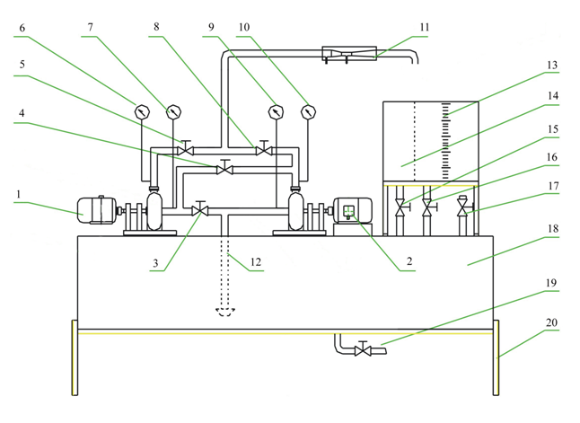 1、泵Ⅰ 2、泵Ⅱ 3、進水閥 4、串聯(lián)閥 5、出水閥(泵1) 6、壓力 7、真空