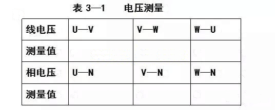 相電壓精確測量:選好數(shù)字萬用表工作電壓測量范圍(500V或1000V),將探頭各自測二根火線零線U、V;V、W;W、U將讀值填寫表3—1中。